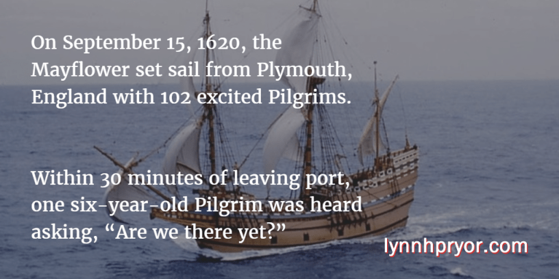 Humor, This Week in History This Week in History – The Journey Begins Date: September 15, 2015Author: Lynn H. Pryor 0 Comments On September 15, 1620, the Mayflower set sail from Plymouth, England with 102 excited Pilgrims. Within 30 minutes of leaving port, one six-year-old Pilgrim was heard asking, “Are we there yet?” Share this post Click to share on Facebook (Opens in new window) Facebook Click to share on Pinterest (Opens in new window) Pinterest Click to share on X (Opens in new window) X Click to email a link to a friend (Opens in new window) Email Click to share on LinkedIn (Opens in new window) LinkedIn Click to share on Reddit (Opens in new window) Reddit Click to share on Tumblr (Opens in new window) Tumblr Click to print (Opens in new window) Print Like Loading...
