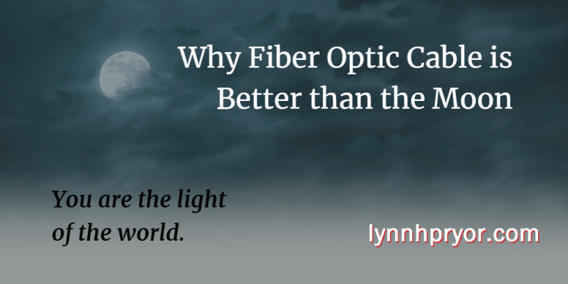 The nerd in me likes fiber optic cable. We moved into a new house a few months ago, and they wired the house for fiber optic cable. Whiz-bang, that stuff is fast. I experience absolutely no delay in seeing the kitten videos friends are constantly sharing. A kitten video can circle the globe in one-seventh of a second. Our old-school phones transmit on wires; cell phones use radio signals; fiber optics uses light.