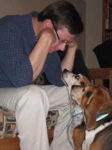 Even as the beagles aged, their enthusiastic greetings never waned. And even after they both died, the exuberant greeting at the back door continued. To this day as soon as I hear the garage door going up announcing Mary’s arrival, I head to the back door. I have no tail to wag, but I do my best to make Mary glad she’s home.