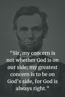 I don’t know if the following Lincoln anecdote is true (I can’t find the original source), but it is a fitting story. We know Lincoln’s greatest challenge during his presidency was that pesky Civil War. During the thick of the conflict, one of Lincoln’s advisors quipped that he was sure glad God was on the side of the Union. Lincoln simply said, “Sir, my concern is not whether God is on our side; my greatest concern is to be on God’s side, for God is always right.”