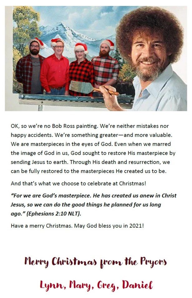 As usual, Lynn, a great Christmas card. 😂. Thank you and Merry Christmas to Mary, you ( notice who gets top billing), Greg and Daniel,