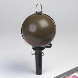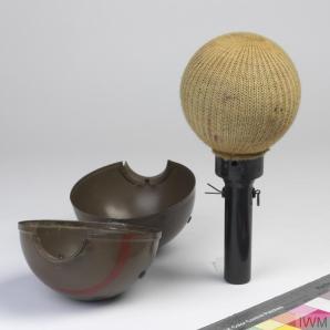 Pull pin #1. With pin removed, the metal casing falls off, revealing the adhesive-soaked ball.- Pull pin #2, arming the mechanism with a five-second fuse.