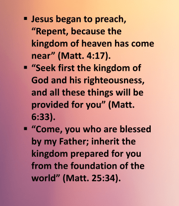 What Jesus talked about more than anything else was the kingdom of God. The kingdom of God encompasses the life we have now with Christ, and it includes our eternity with Him. His kingdom is in our midst now, but a day is coming when His children will dwell in His presence in His eternal kingdom. We euphemistically refer to this as heaven—and living in His presence with definitely be heavenly.